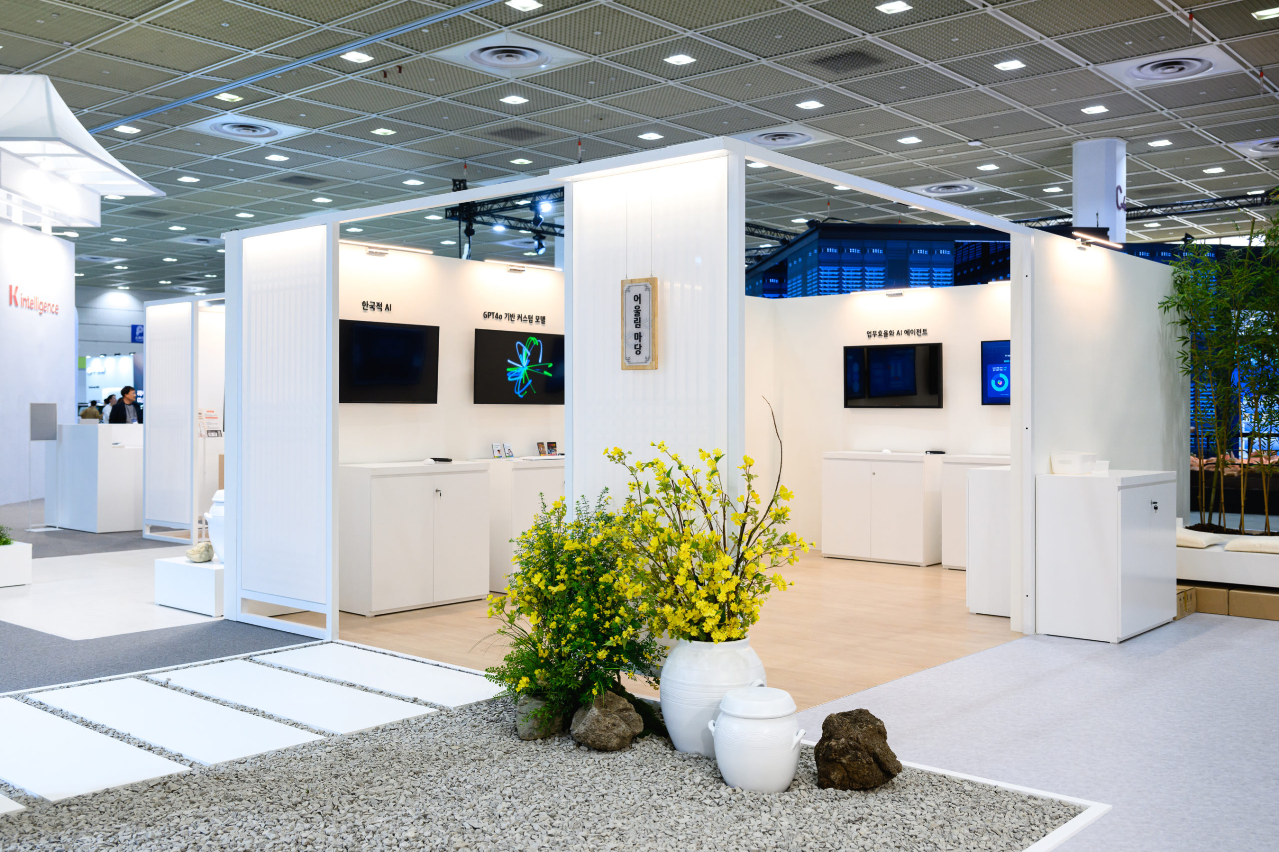 The exhibition space, adorned in white and filled with cherry blossoms and canola flowers reminiscent of spring in Korea, drew inspiration from traditional Korean elements such as gates and courtyards to highlight the beauty of Korean spatial design. In particular, the use of low walls—symbolic of Korea’s open and communicative culture—created a sense of openness throughout the space, offering warm and familiar scenes of people coming and going. This setting embodied the emotional essence of KT’s vision for Korean-style AI.